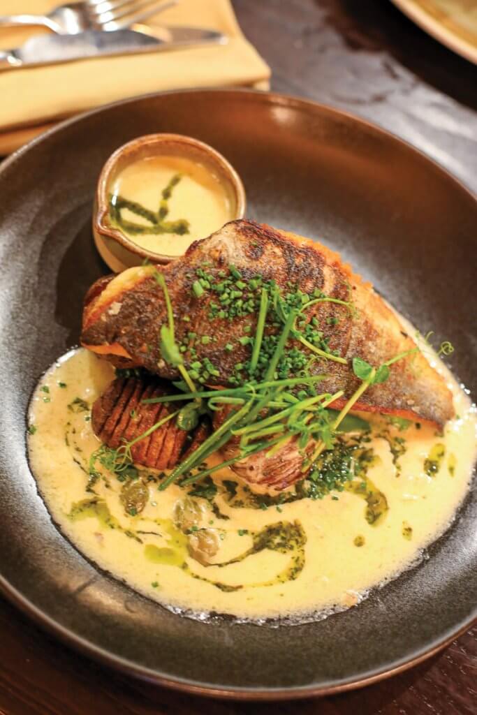 Moving on to the mains, the pan-fried sea bream was a real highlight – a dish that showcased both precision and restraint. The skin delivered that perfect crispness, almost snapping as the fork met it, revealing beautifully moist, delicately flavoured fish beneath. Accompanied by sautéed spring greens and a caper beurre blanc, the dish carried a gentle salinity, lifted by the subtle sharpness of the capers and the silky richness of the white wine-based sauce. The Hasselback potatoes added both texture and substance, their crisp edges and soft centres completing a plate where every element was thoughtfully balanced – salty, fresh, and delicately indulgent, all harmonising into a truly memorable dish.